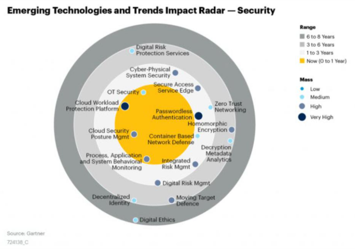 암호없는 인증, 클라우드 워크로드 보호 플랫폼 및 클라우드 보안 상태 관리는 향후 3년 이내에 사이버 보안에서 가장 영향력있는 기술장 하나가 될것으로 예상됩니다. 올해 10월 가트너는 보안 프레임 워크를 위한 Impact Radar를 도입했습니다. 새로운 프레임 워크 목표 중 하나는 특정 기간 또는 범위 내에서 특정 사이버 보안 기술이 얼마나 영향력이 있는지 비교하는 것입니다. 제로 트러스트 네트워킹은 1~3년 내에 상당히 영향력이 있을것으로 예상됩니다.